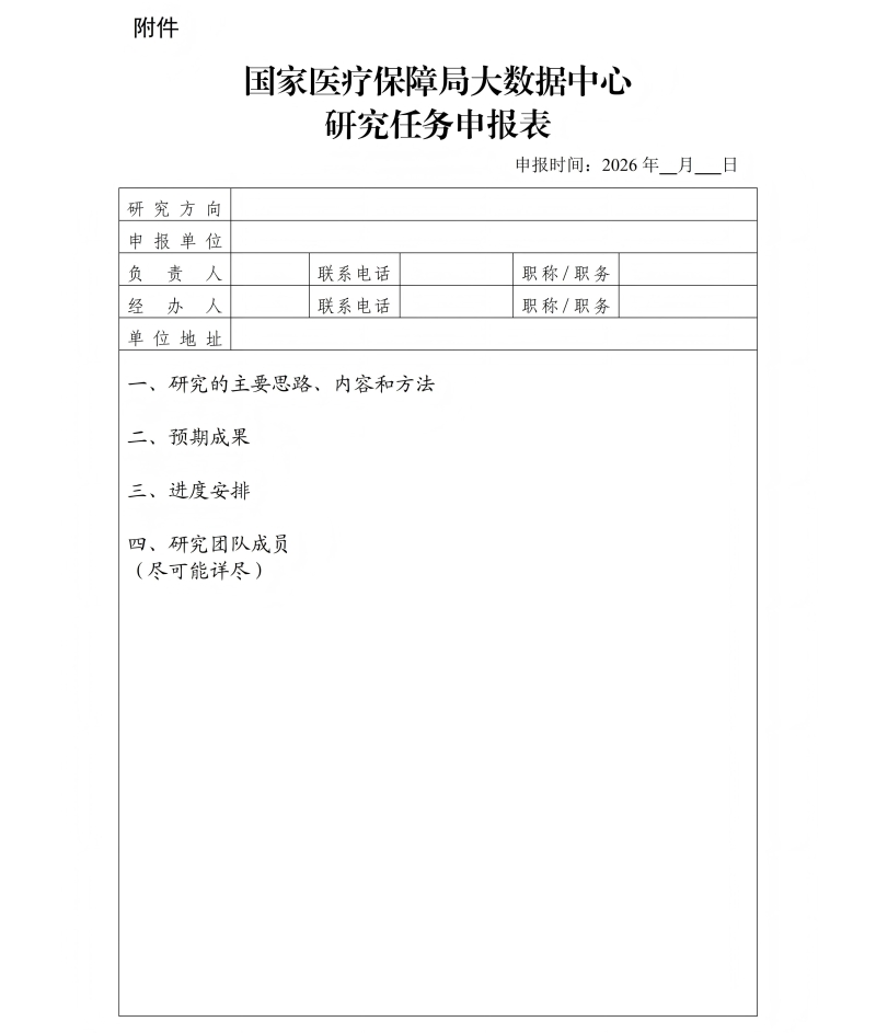 2.提交方式:意向機(jī)構(gòu)及個(gè)人請(qǐng)于2026年2月6日下午18:00前,將《研究任務(wù)申報(bào)表》電子版發(fā)送至大數(shù)據(jù)中心編碼標(biāo)準(zhǔn)處郵箱:ybbm@nhsa.gov.cn,郵件主題命名為“研究方向—申報(bào)機(jī)構(gòu)/個(gè)人名稱”。